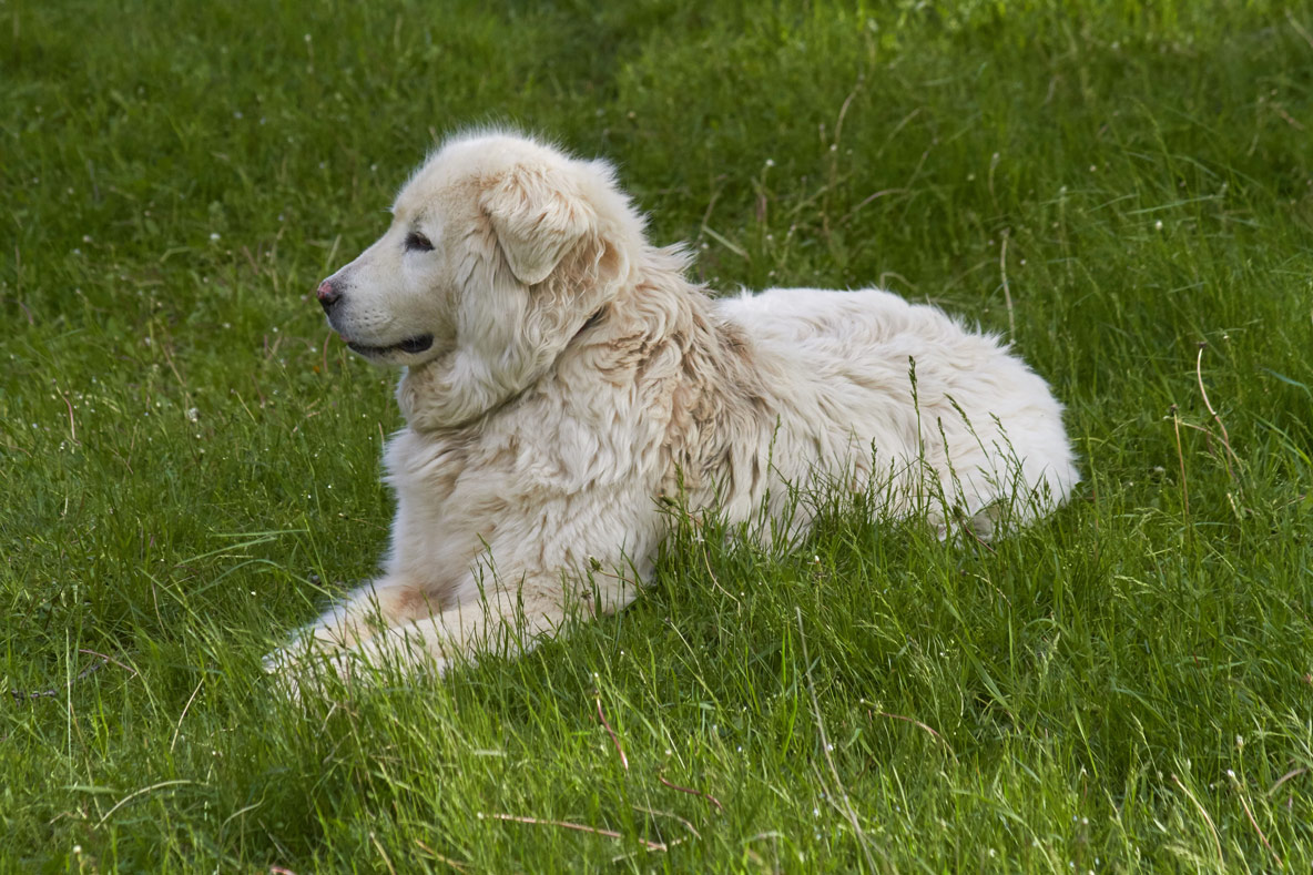 She understands that her job most of the time is to help the sheep feel at peace. The sheep feel that sense of peace and depend on her to announce if there is danger. Otherwise, they go about their day grazing in the pasture or off a large hay bale. Sometimes she is lying on the ground between the sheep and toward whichever direction she senses danger may approach. She may be on the higher ground of a hillside, where she can see all of the sheep and they can see her. That also gives her a view of anything that can be approaching from a distance. Sometimes she is at rest in the middle of the sheep while they are grazing. However, in any of these cases she is usually on watch—looking and listening for any possible trouble. The sheep stay largely together, but sometimes they spread out over the entire pasture. In either case, Arya will periodically walk through the flock. She will calmly wind back and forth among them to make her presence known. There are times she'll be a short distance away from the sheep because it's hot, and she needs to be in the shade of trees or a building.